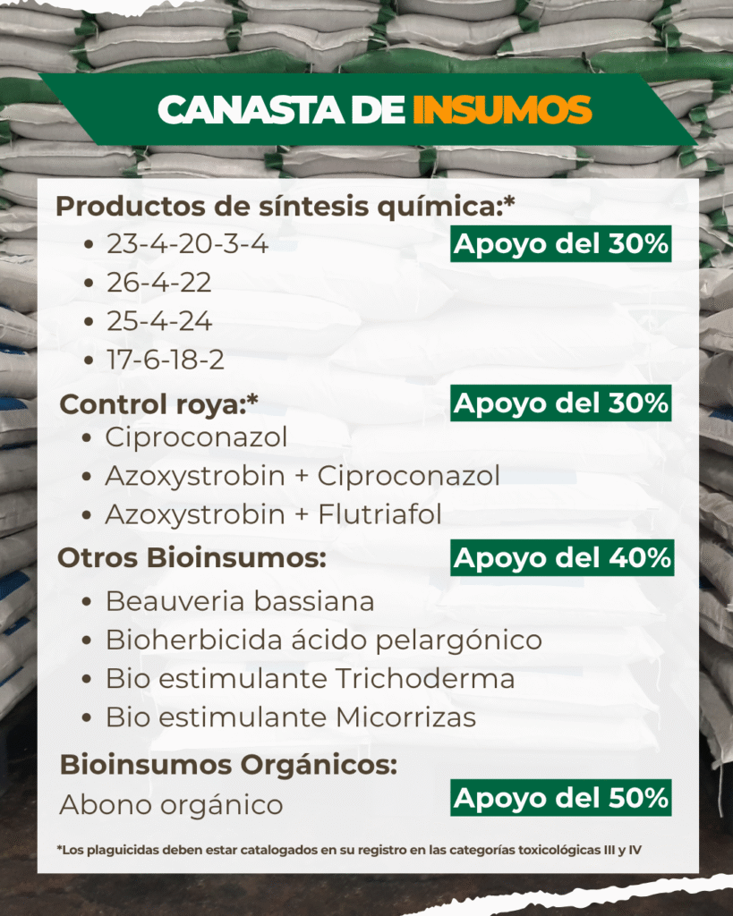 La canasta de insumos está compuesta por fertilizantes, bioinsumos y bioplaguicidas a los pequeños productores de café de no más de 5 hectáreas en edad productiva.